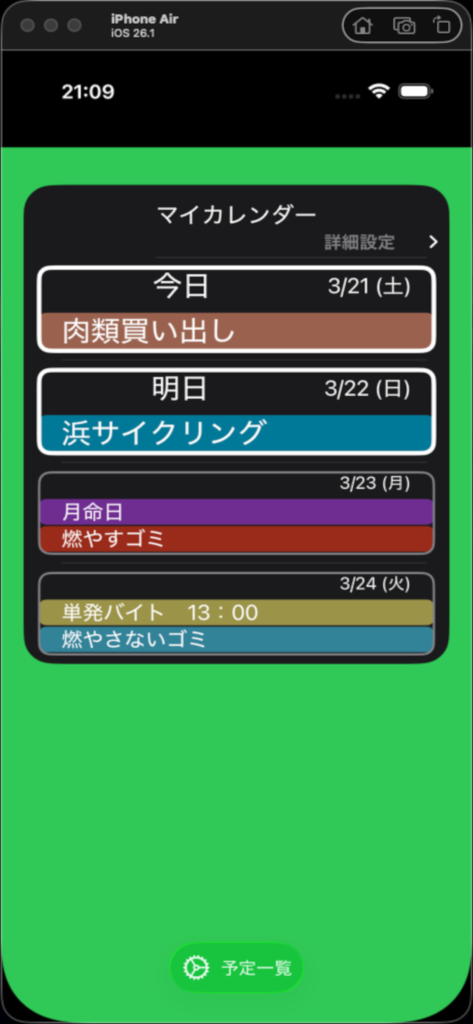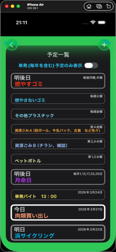 画面下部の ”⚙️予定一覧” ボタンタップで、予定一覧画面へ遷移。